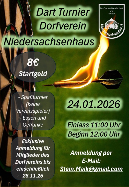 „Für das leibliche Wohl ist natürlich auch gesorgt. Es gibt Bratwurst, Krakauer, Pottwurst, Erbsensuppe, belegte Brote, Waffeln, Langosch, Stockbrot zum selber machen, verschiedene heiße und kalte Getränke und natürlich das große Torten-/Kuchenbuffet“. Der Dorfverein freut sich wieder über gespendete Kuchen und Torten. Alle Spenden können am 29.11.2025 ab 10:00 Uhr am Niedersachsenhaus abgeben werden. Die Spender erhalten auch wieder ein kleines Geschenk als Dank.